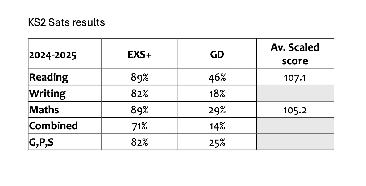 We are proud to share our KS2 assessment results for the 2024–2025 academic year. These outcomes reflect the hard work and dedication of our pupils, staff, and wider school community. Please see the full results below for a detailed breakdown of our performance across all key subjects.